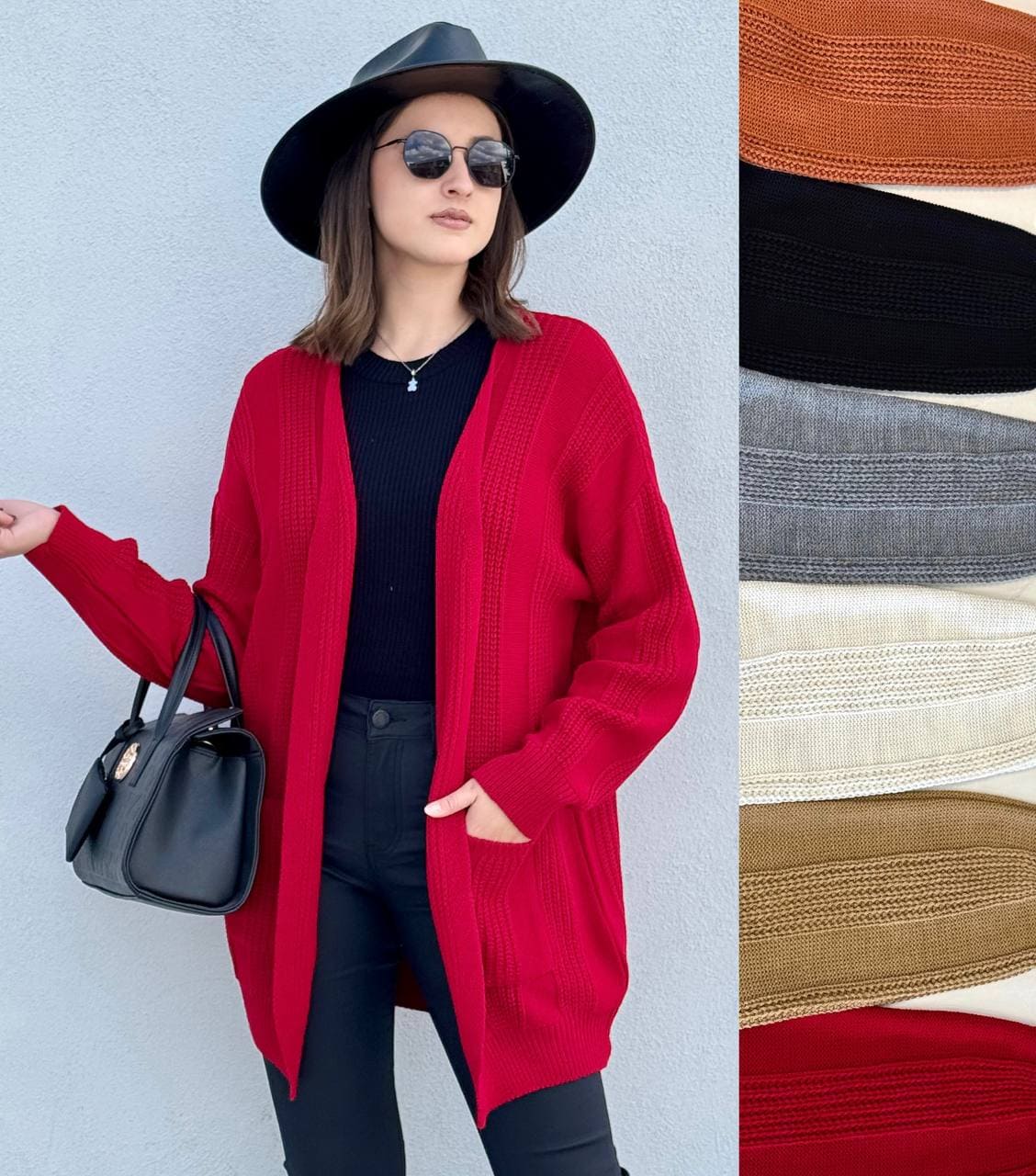 Ensamble de tejido bordado de linea con bolsa a los lados.